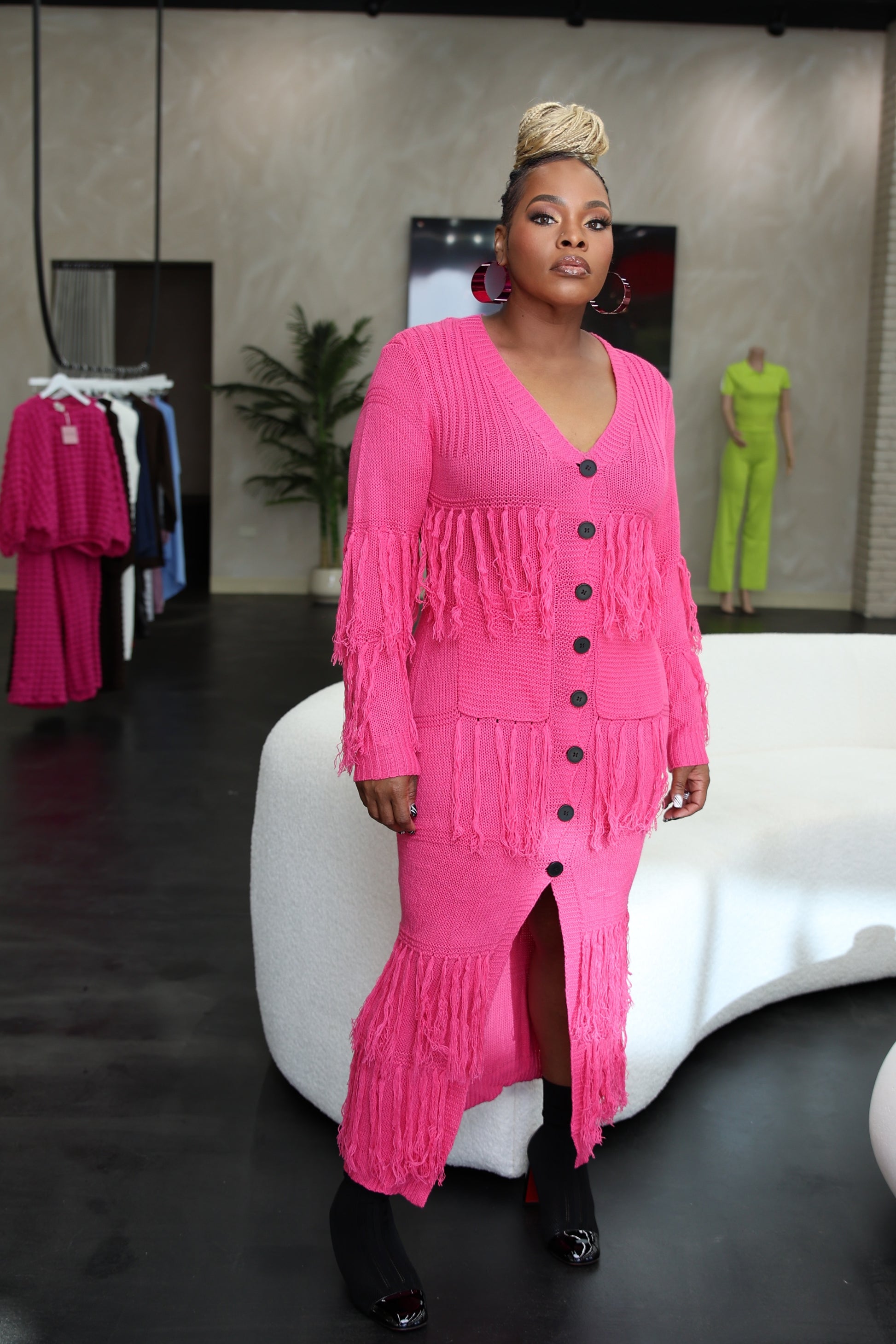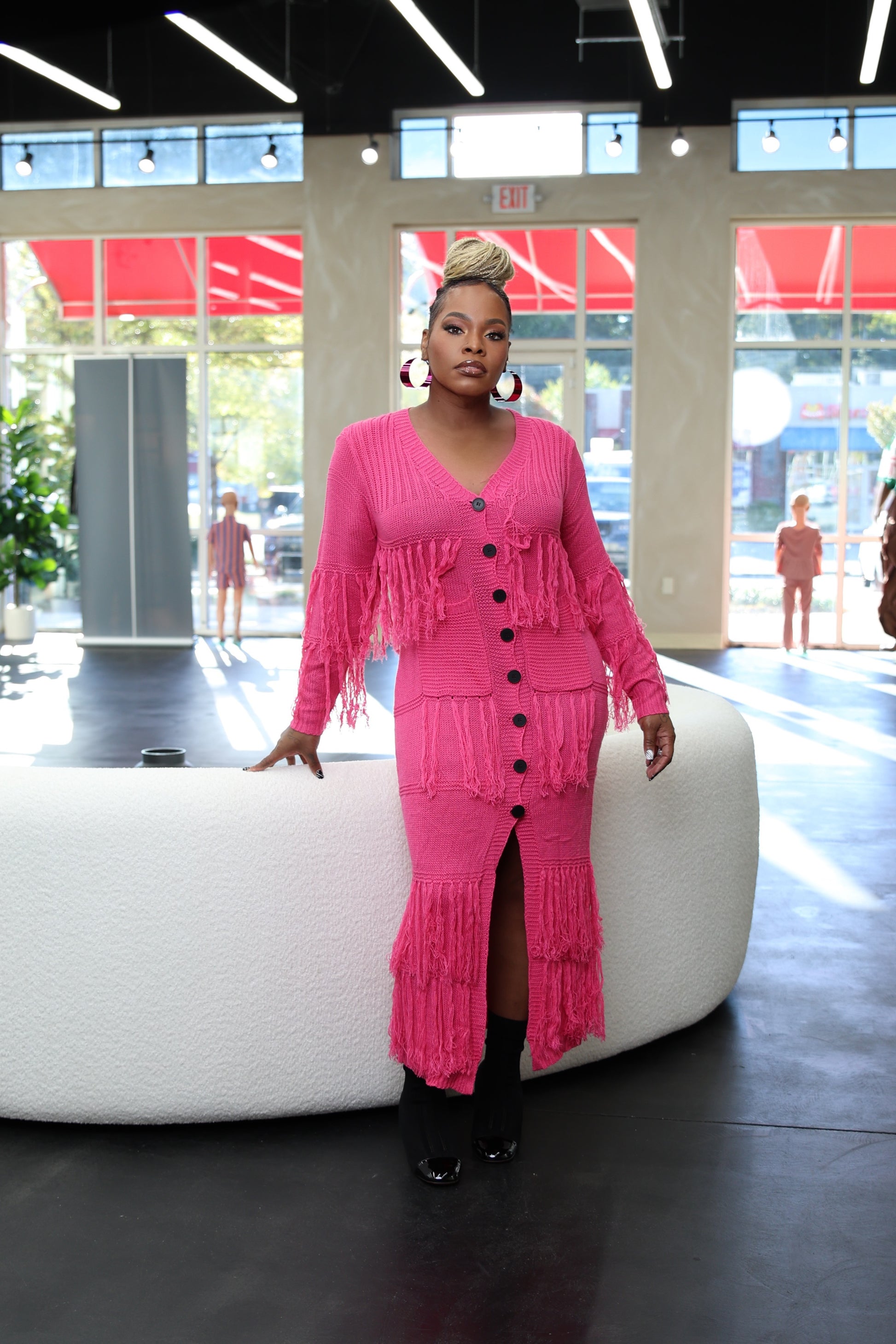 This maxi fringe cardigan dress combines cozy knit comfort with statement-making style. Designed with bold fringe accents throughout, it creates dynamic movement with every step. The button-down front allows versatile wear, whether closed as a figure-flattering dress or layered open as a cardigan. Perfect for elevating casual days or adding drama to night outings, this piece brings texture, flair, and effortless confidence to your wardrobe.