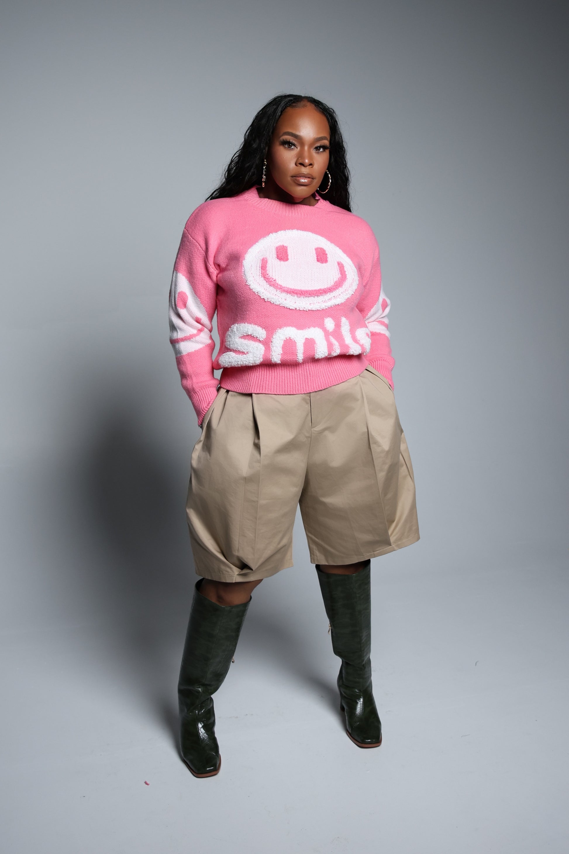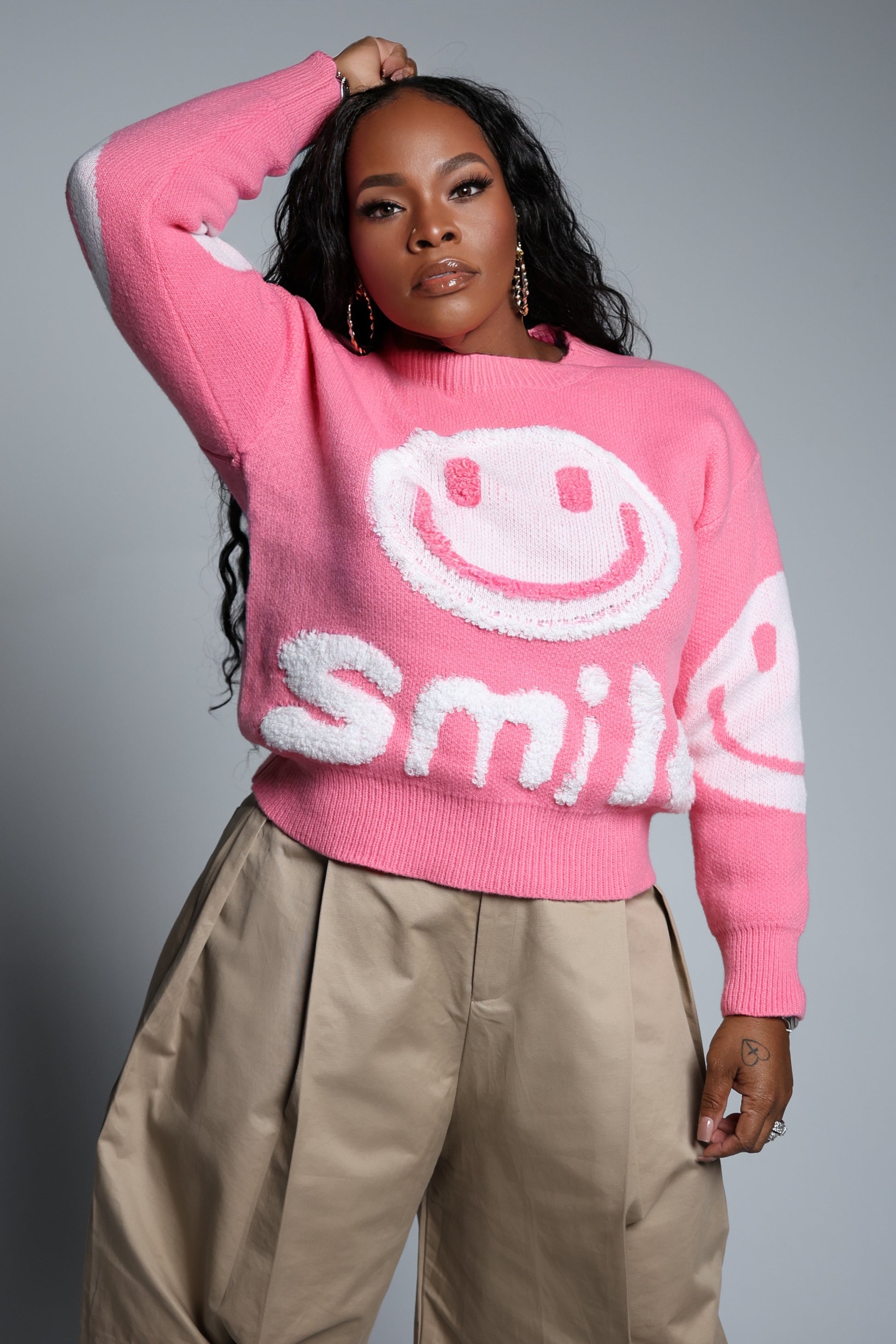 This stylish sweater captures the essence of joy with its cheerful smiley face and playful "smile" text design. Crafted from soft, cozy fabric, it features a relaxed fit with ribbed cuffs and hem for added comfort. Perfect for layering over your favorite jeans or leggings, this sweater is versatile enough for casual outings or cozy nights in.